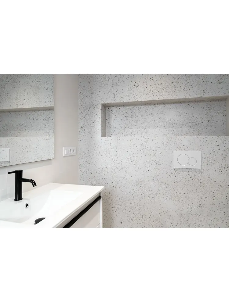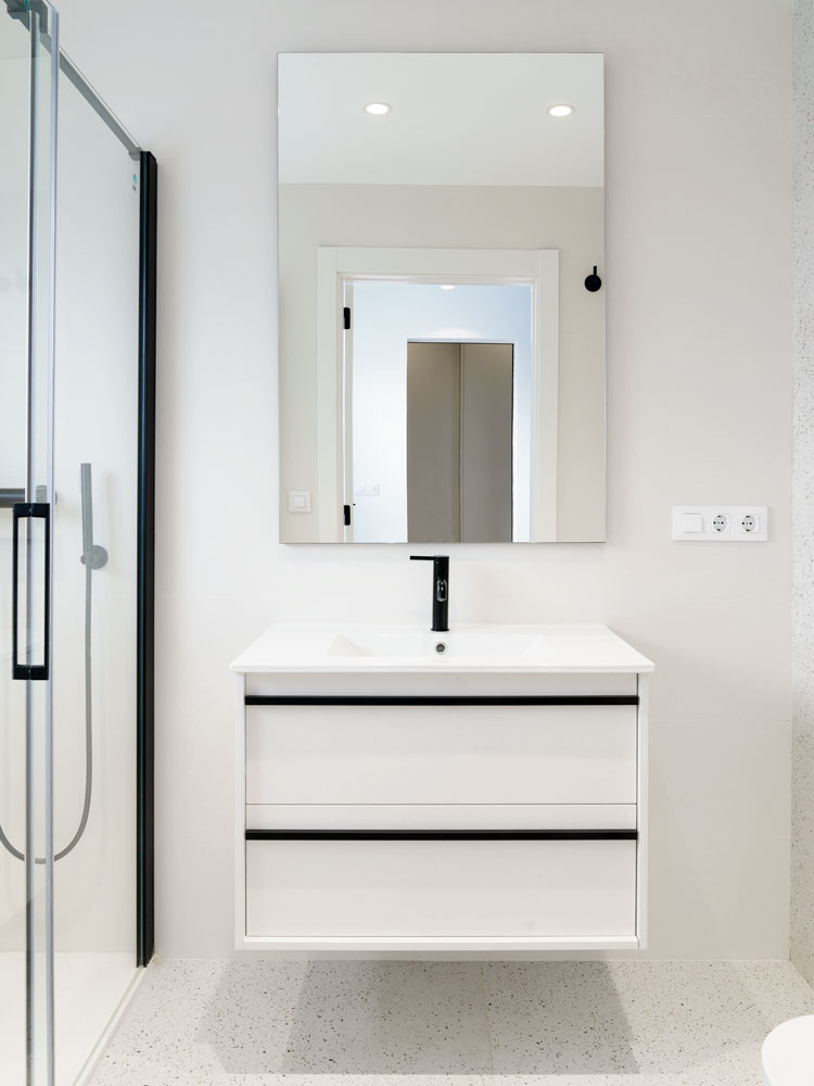 La paleta de materiales utilizada es un híbrido entre calidez y modernidad. La madera, la piedra natural y el predominio del blanco se combinan de forma armoniosa, generando un hogar cálido, elegante y atemporal.