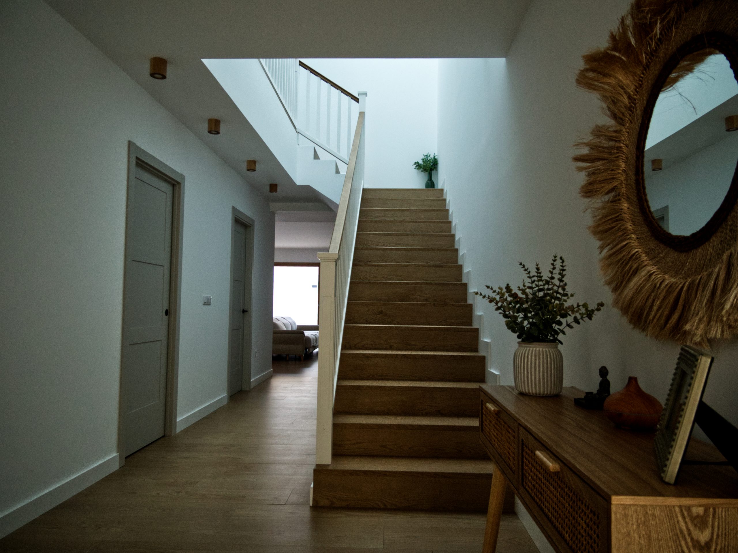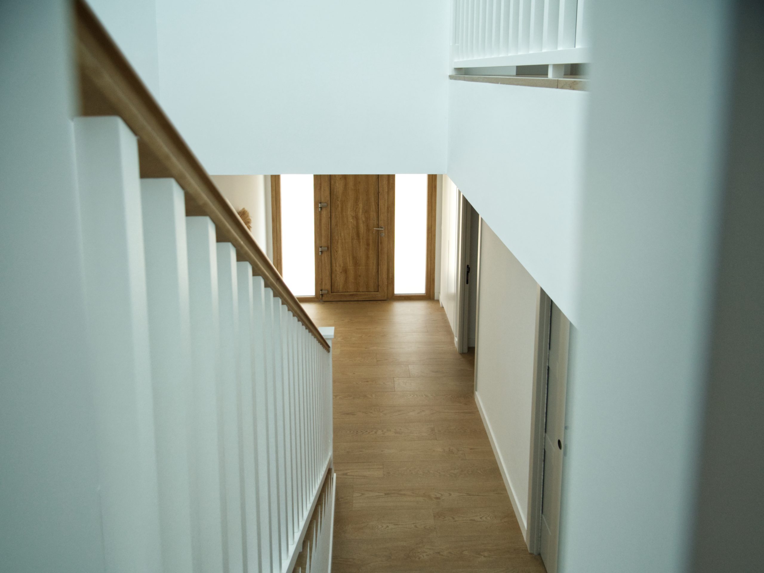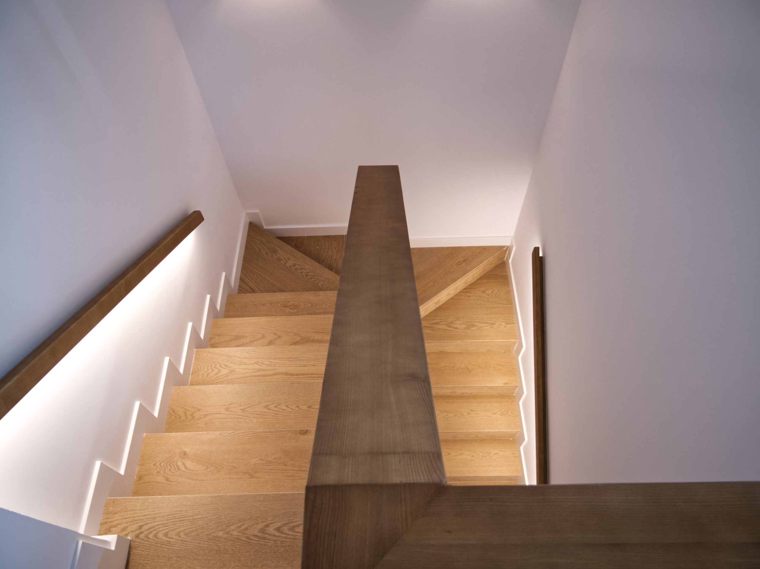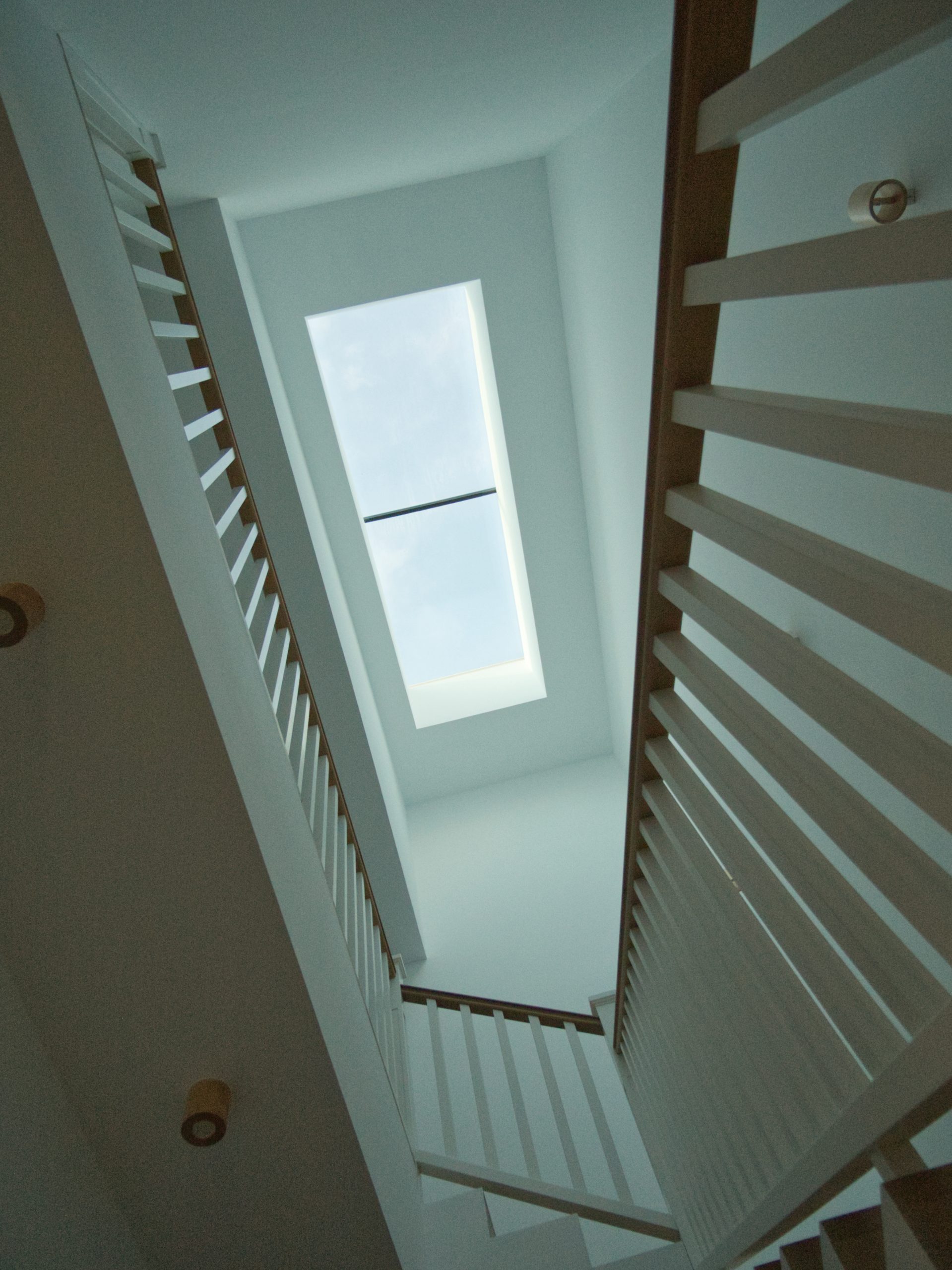 La vivienda se articula a través de un espacio central en doble altura donde se sitúa una amplia escalera bañada por la luz cenital procedente de un imponente lucernario que introduce la luz natural y simula el cielo abierto.