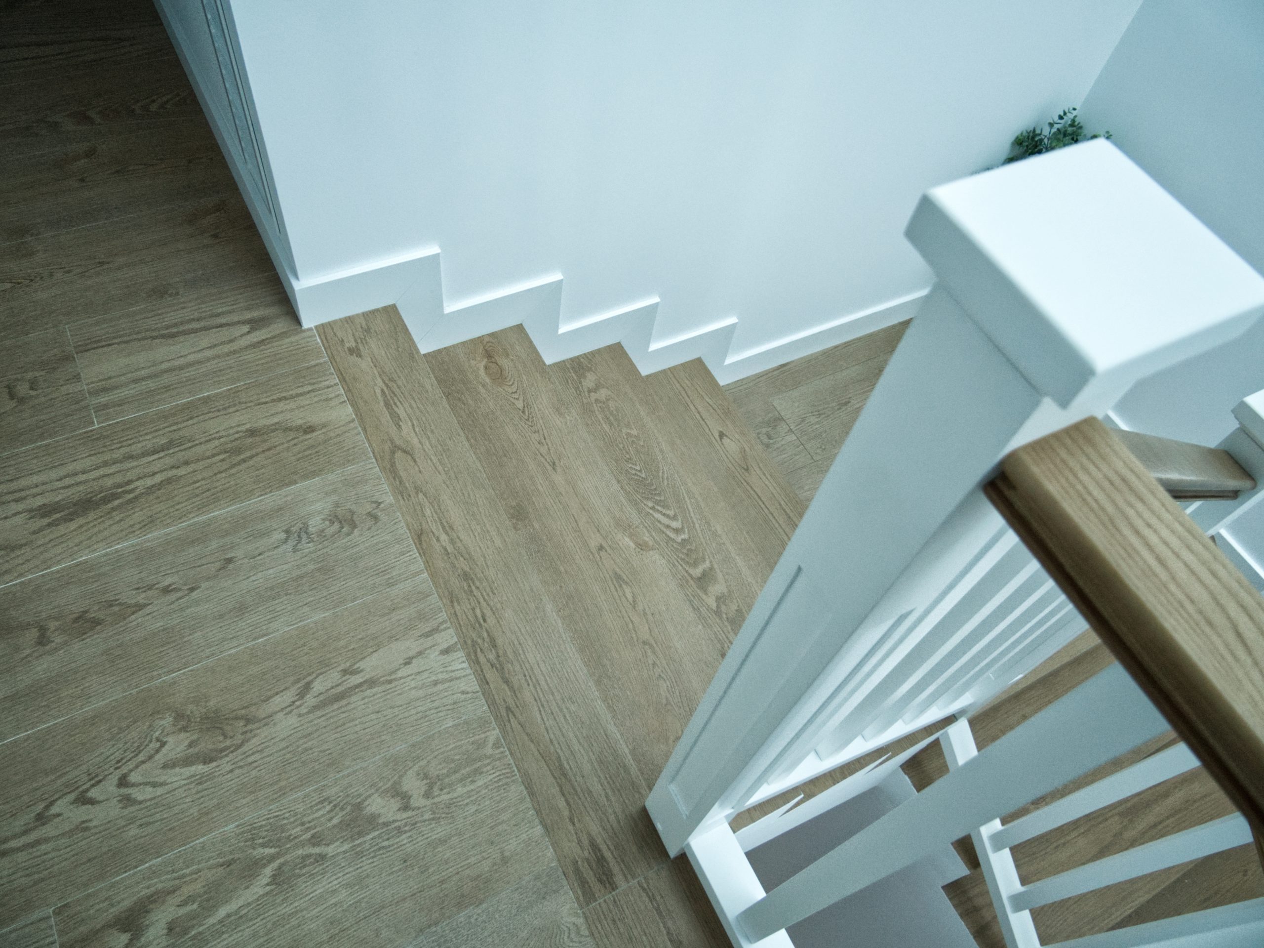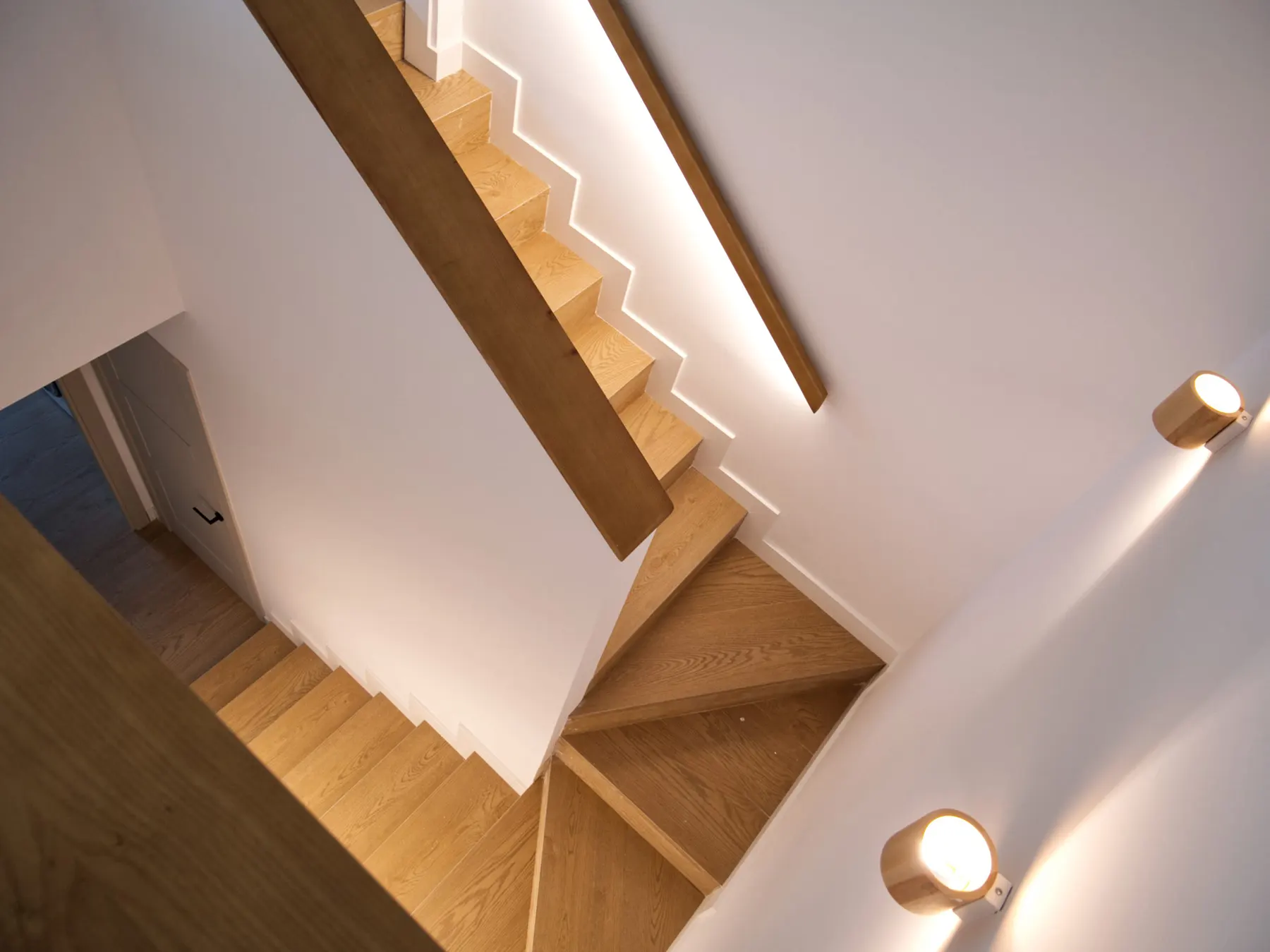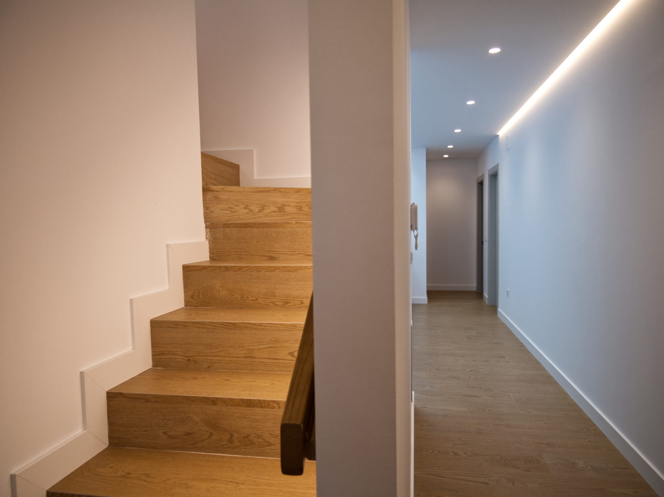 La vivienda se articula a través de un espacio central en doble altura donde se sitúa una amplia escalera bañada por la luz cenital procedente de un imponente lucernario que introduce la luz natural y simula el cielo abierto.