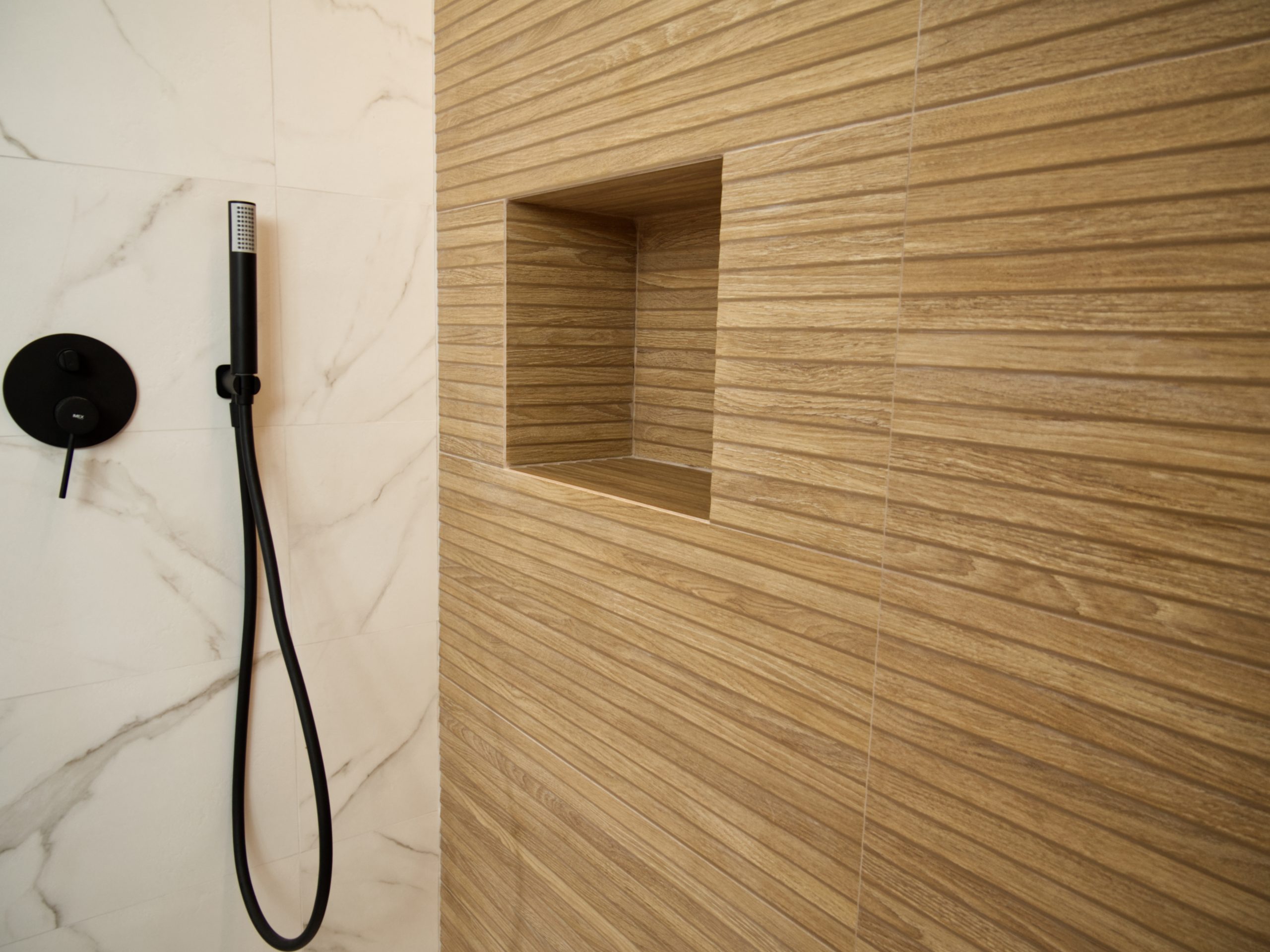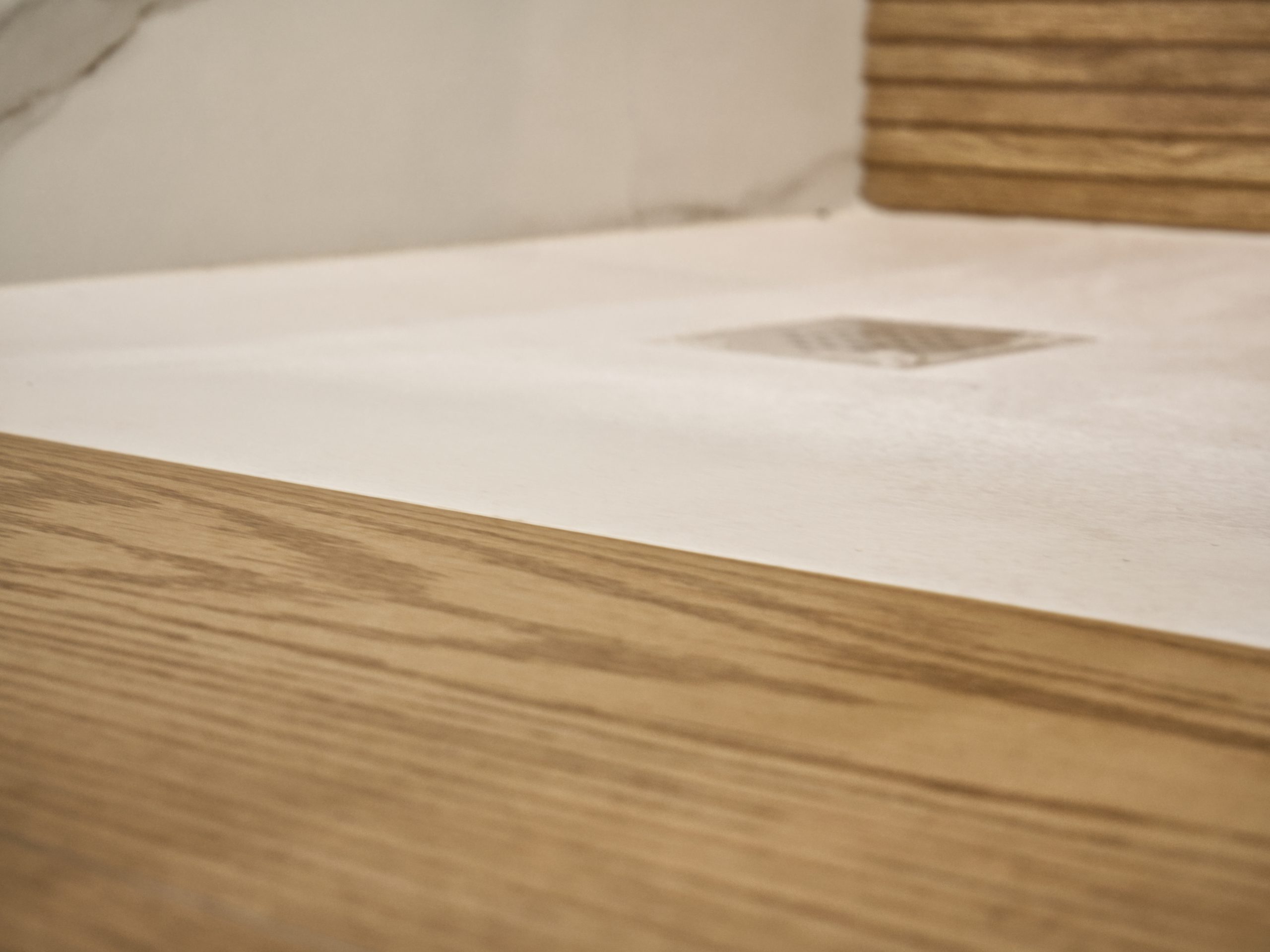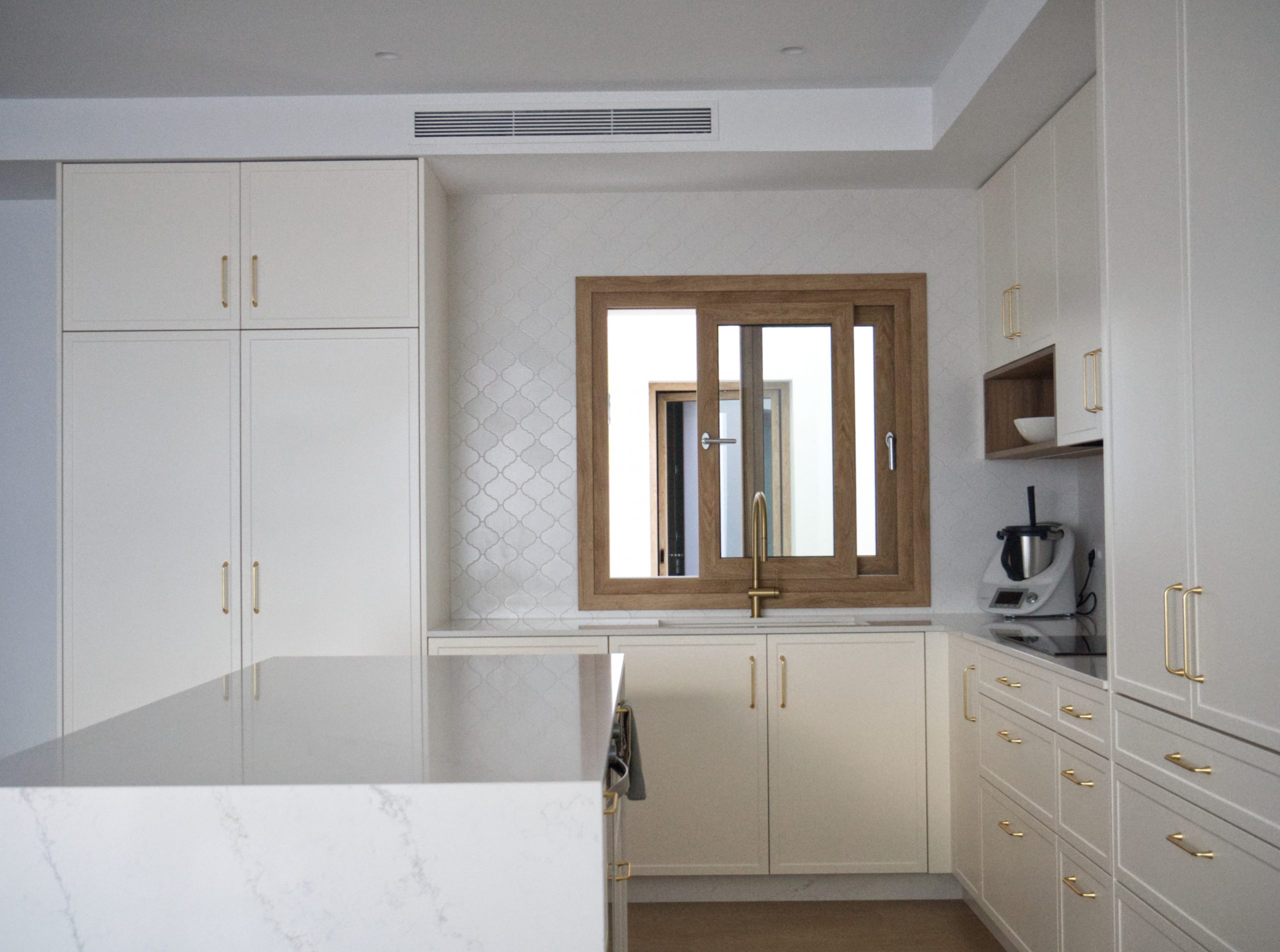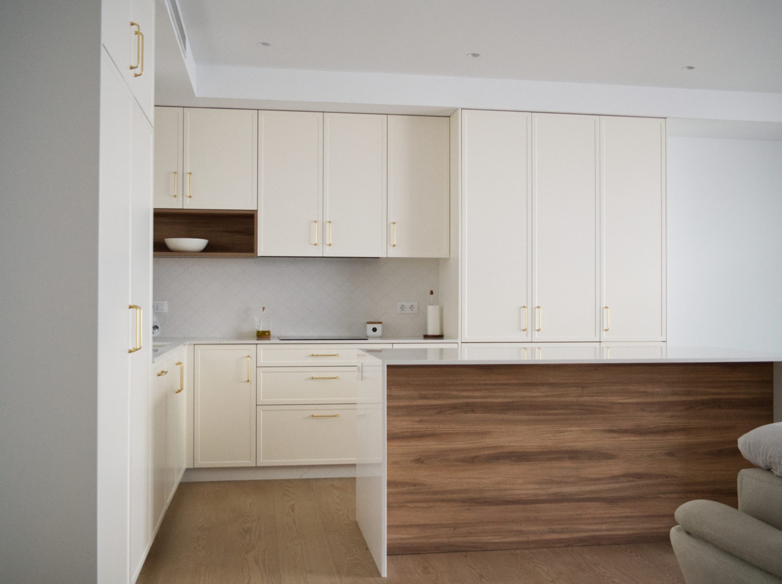 La paleta de materiales utilizada es un híbrido entre calidez y modernidad. Madera, porcelánicos color crema, piedra natural y mortero blanco, combinan de forma armoniosa generando un hogar cálido, acogedor y atemporal.