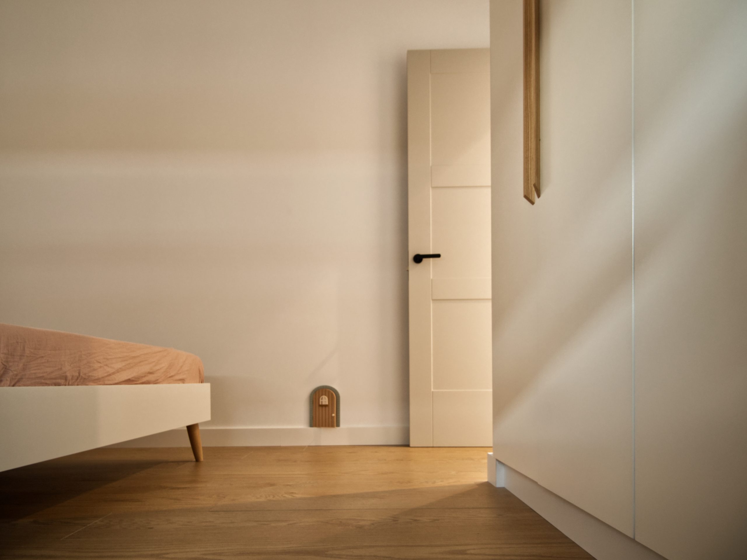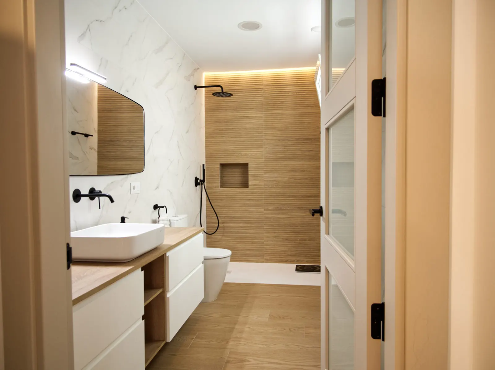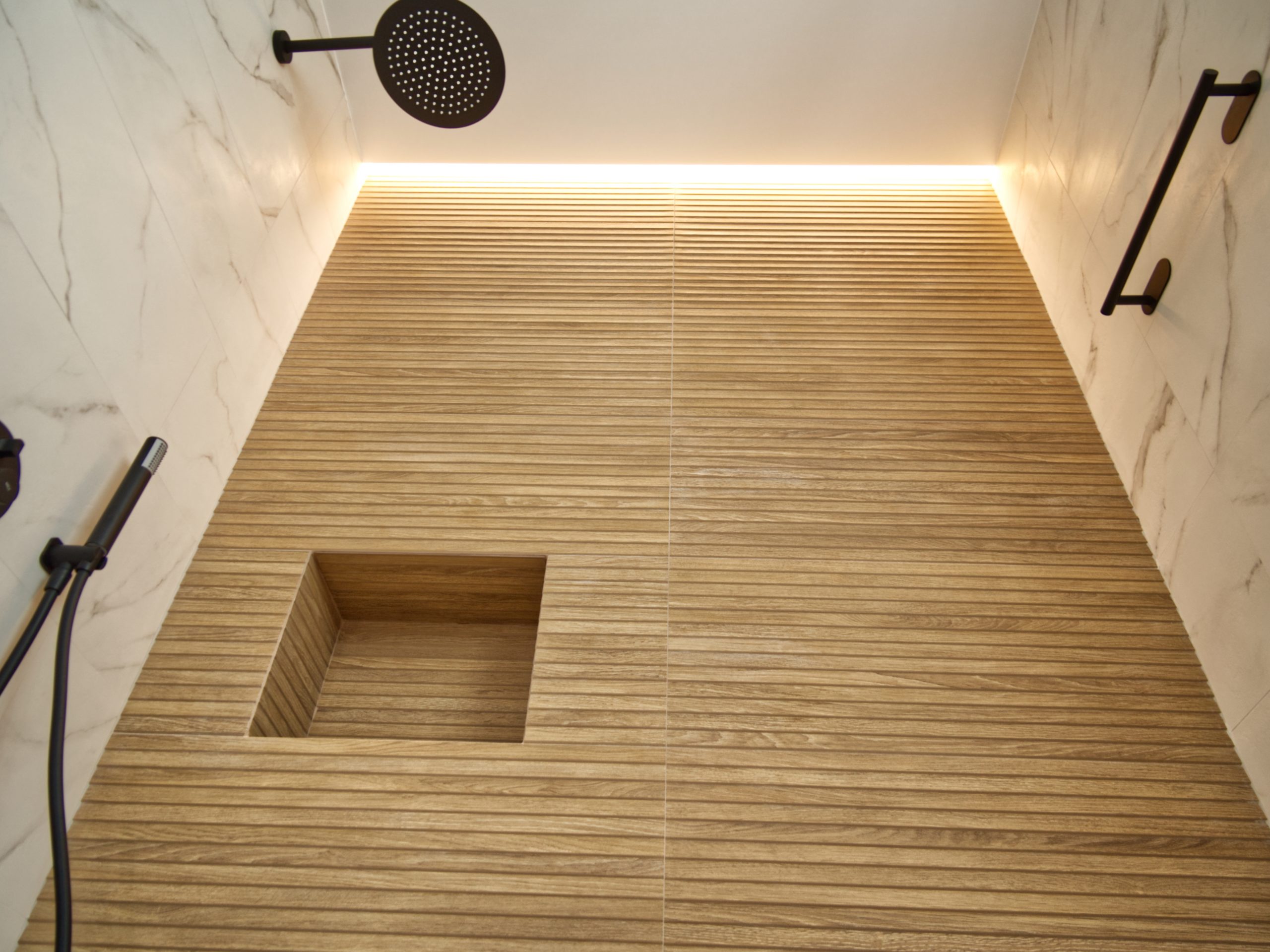 La paleta de materiales utilizada es un híbrido entre calidez y modernidad. Madera, porcelánicos color crema, piedra natural y mortero blanco, combinan de forma armoniosa generando un hogar cálido, acogedor y atemporal.