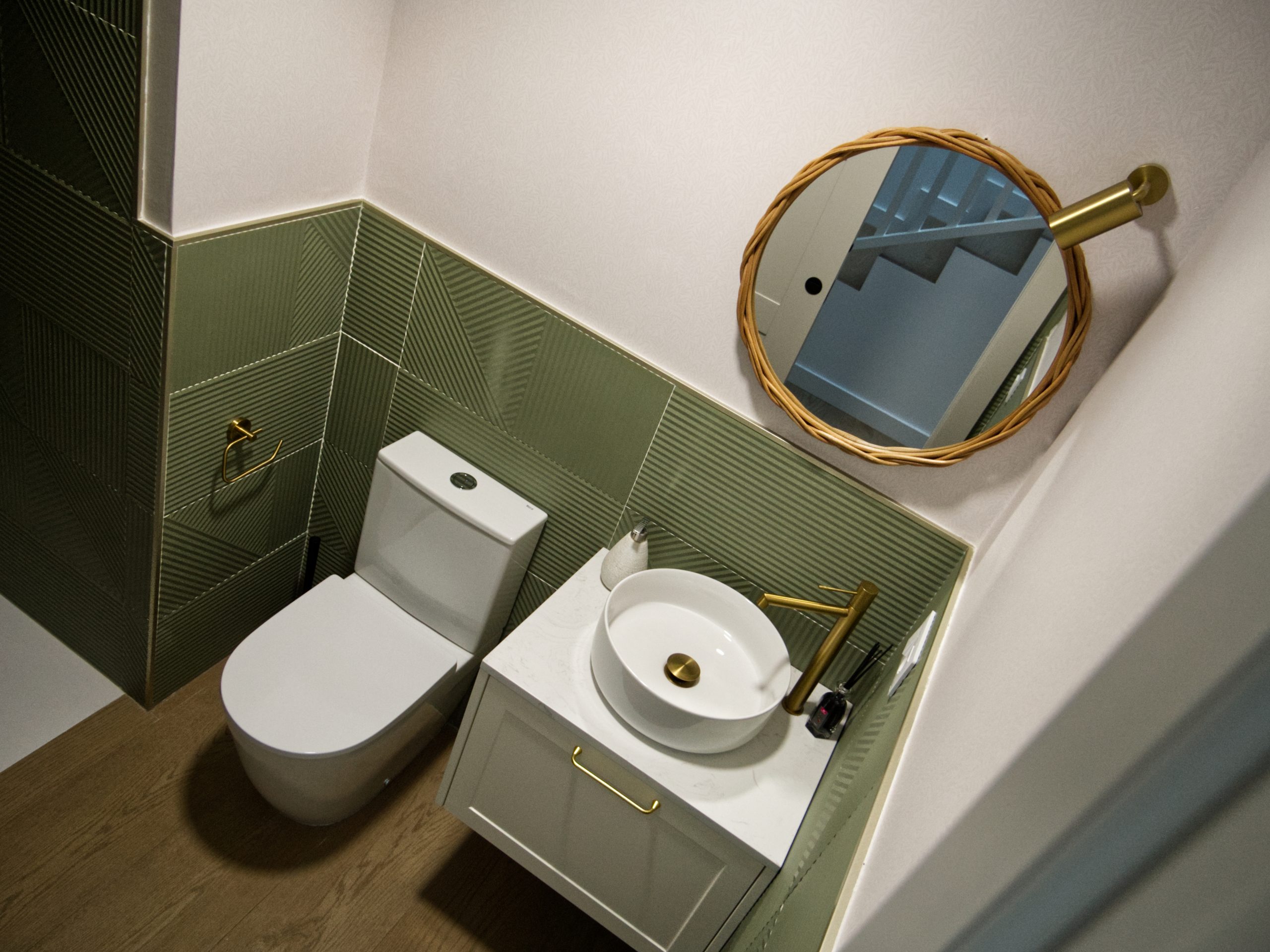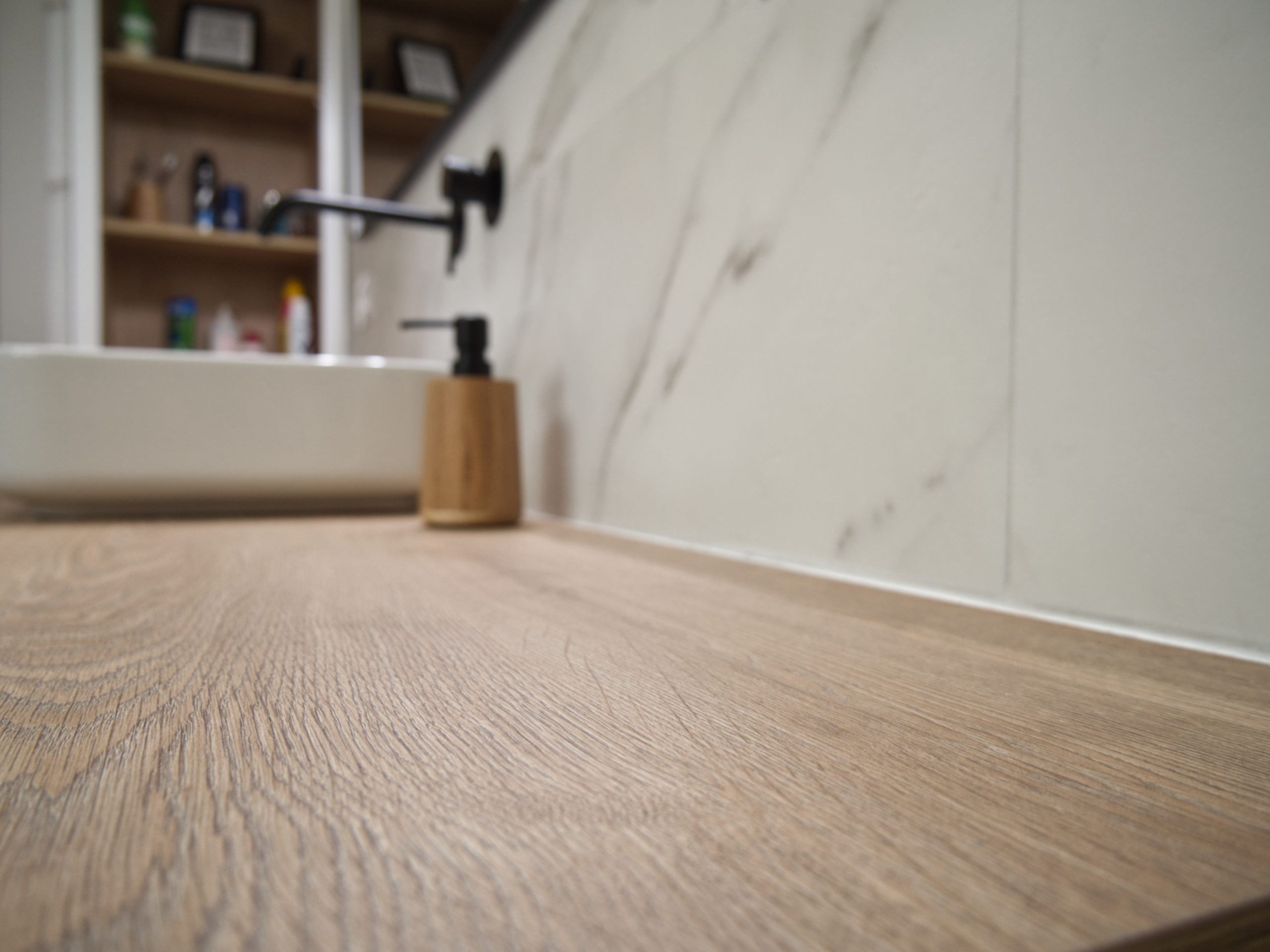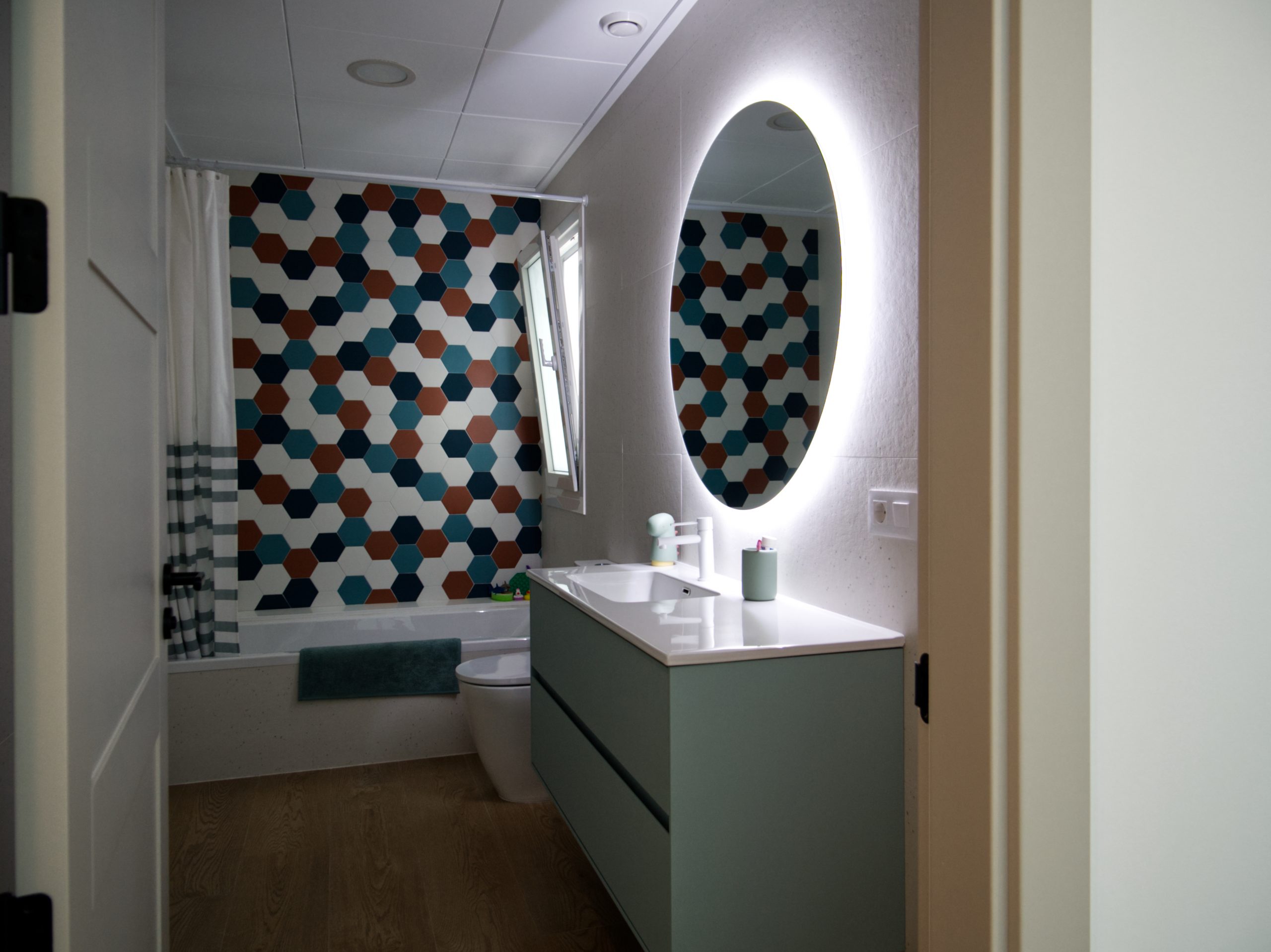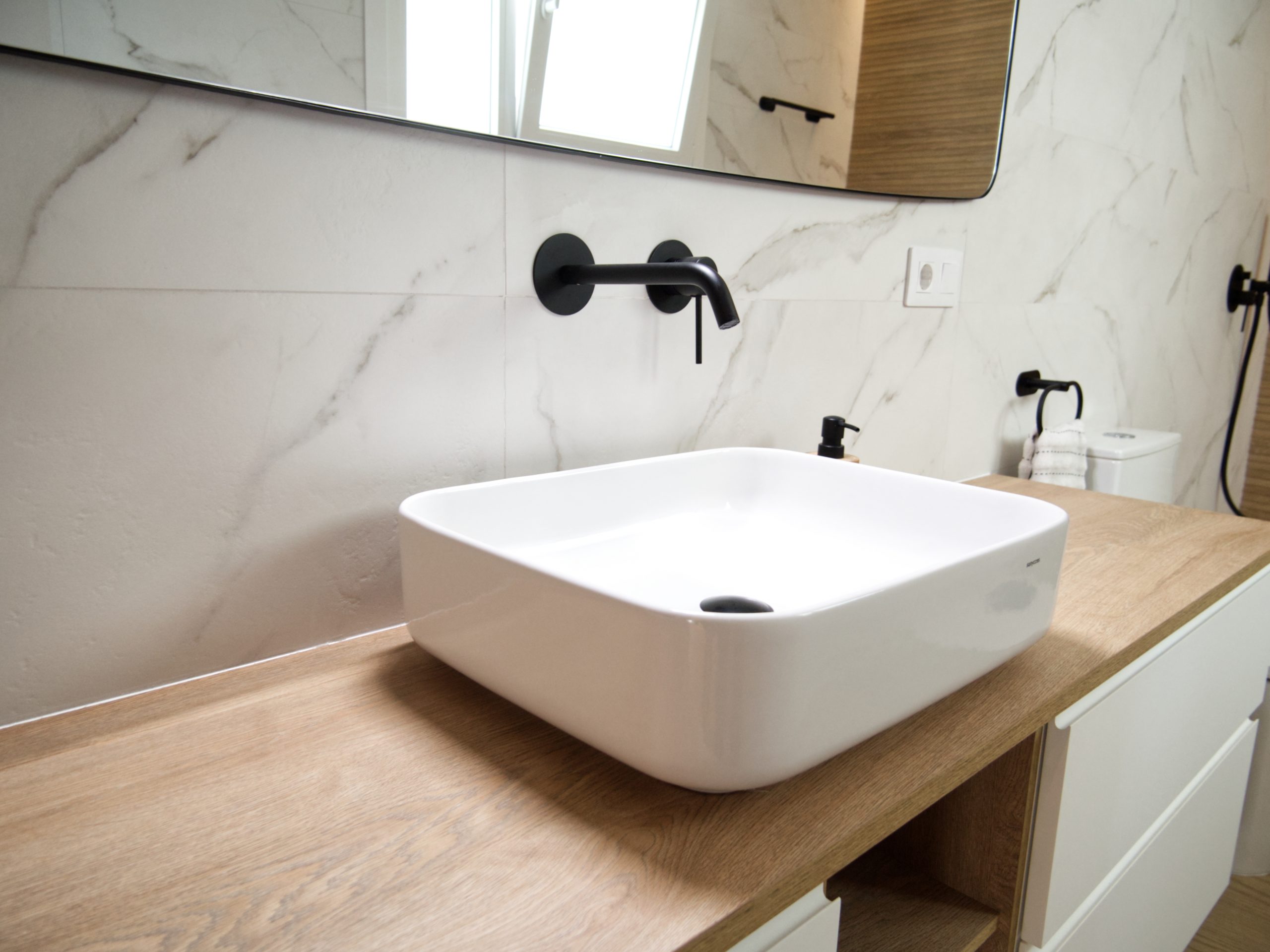 La paleta de materiales utilizada es un híbrido entre calidez y modernidad. Madera, porcelánicos color crema, piedra natural y mortero blanco, combinan de forma armoniosa generando un hogar cálido, acogedor y atemporal.